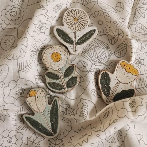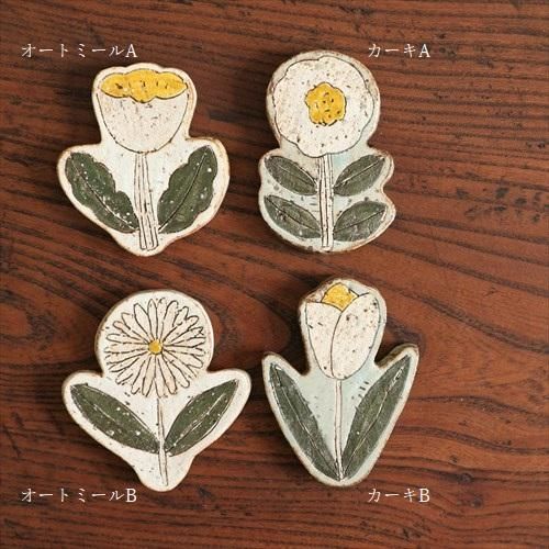 ひとつひとつ手づくりのためカタチや絵が異なりますことご了承ください。マットでアイボリーの表情のオートミールと光沢のあるブルーグレイの雰囲気のカーキの2つの釉薬が使われそれぞれ2つのお花のデザイン。4つの中からお好きなデザインをお選びください。