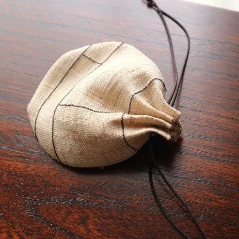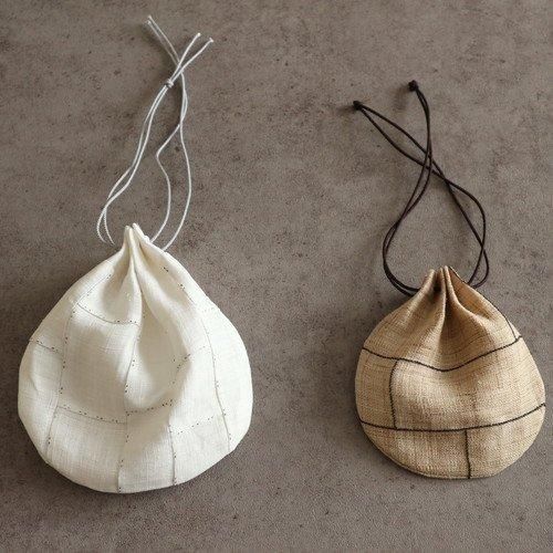 ふっくらな形をした두루주머니(トゥルチュモニ)と呼ばれる定番のカタチ。染が施されていないサムべ(大麻)布を用い、あえて主張する色糸でステッチ。キリで穴をあけダークブラウンカラーのメドゥプ(飾り結び・トンボ結び)紐を通されています。