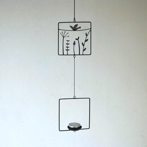 黒くマットな額縁のような枠に草花がのった叙情的なパネルとキャンドルホルダがセットになり天井から吊り下げていただくタイプです。