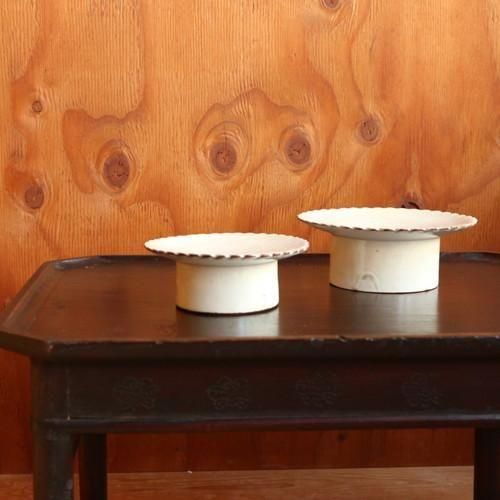 柔らかなオフホワイトの釉薬、縁の凸凹したラウンドがまるで花びらのような高台の皿をご紹介します。