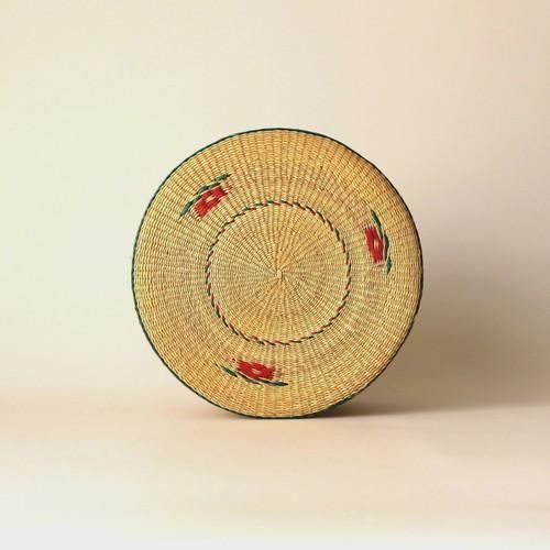 いぐさを細く裂いて均一に編み込み、ところどころに染めた素材を差し込み小さな花模様やラインを作っています。